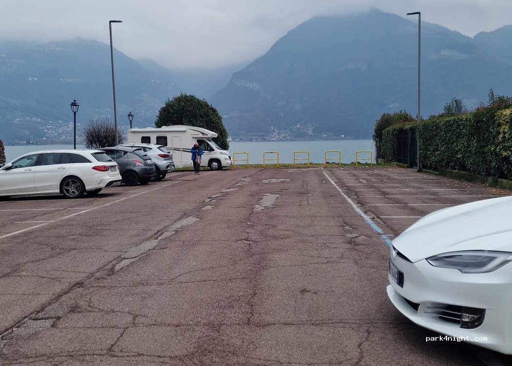 Parcheggio a pagamento durante il giorno(gratuito la notte fino le 9:30). Sconsigliato a mezzi superiori ai 6mt di lunghezza. Parcheggio posto affianco ad un parchetto molto curato direttamente sul lago... La mattina qualche sportivo e qualche mamma che porta il proprio bimbo al parco giochi ma dormito benissimo in un posto fantastico con panorama da favola... Consigliatissimo!!!