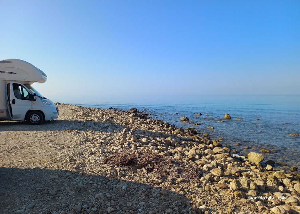 Ausreichend Parkplätze am Meer. Zugang über eine schmale, aber gangbare Straße. Neben dem Parkplatz befindet sich ein großer kostenloser Strand mit der Möglichkeit, Liegen und Sonnenschirme am Kiosk zu mieten. Nachts sehr ruhig und tagsüber lebhaft. Ich empfehle den Kiosk als Erfrischungspunkt, sehr nettes und hilfsbereites Personal.