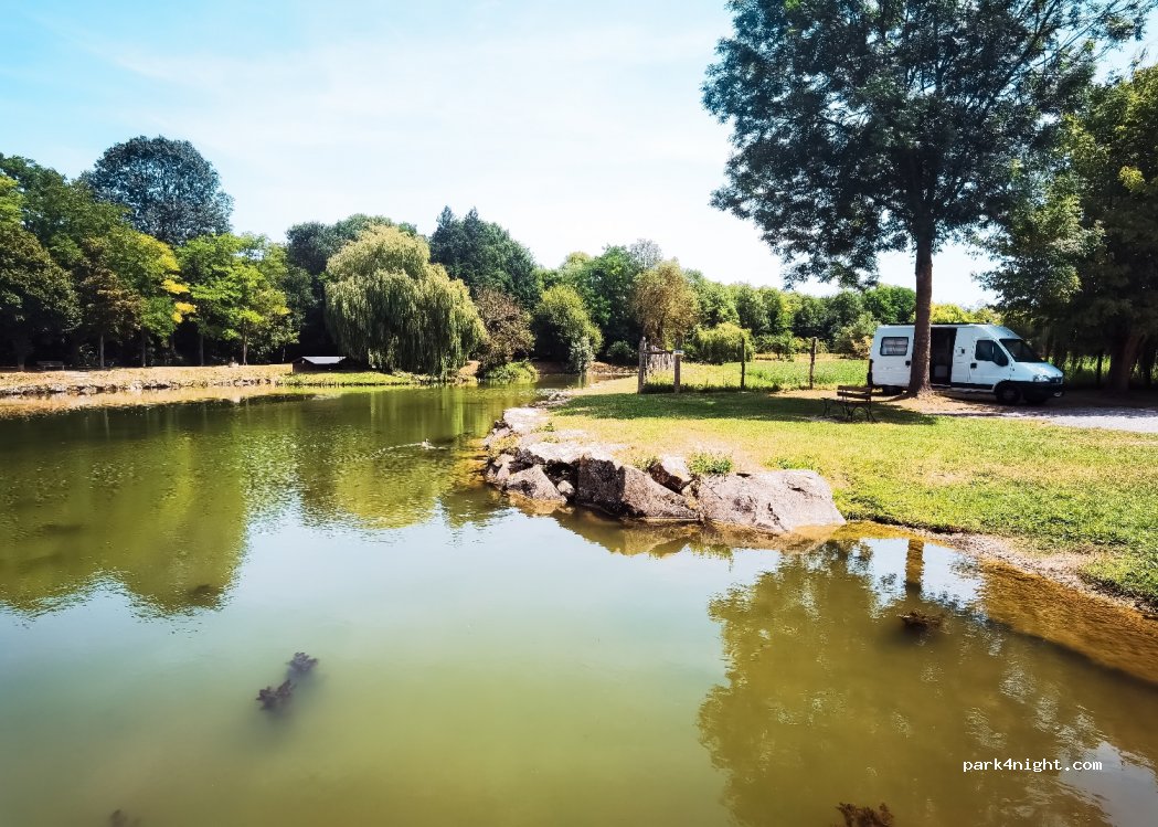 Parking of a magnificent public pond, with the start of a hiking trail, The parking lot is small, therefore, priority for fishermen. About 7 classic car spaces, I asked to stay one night I was allowed ☺️