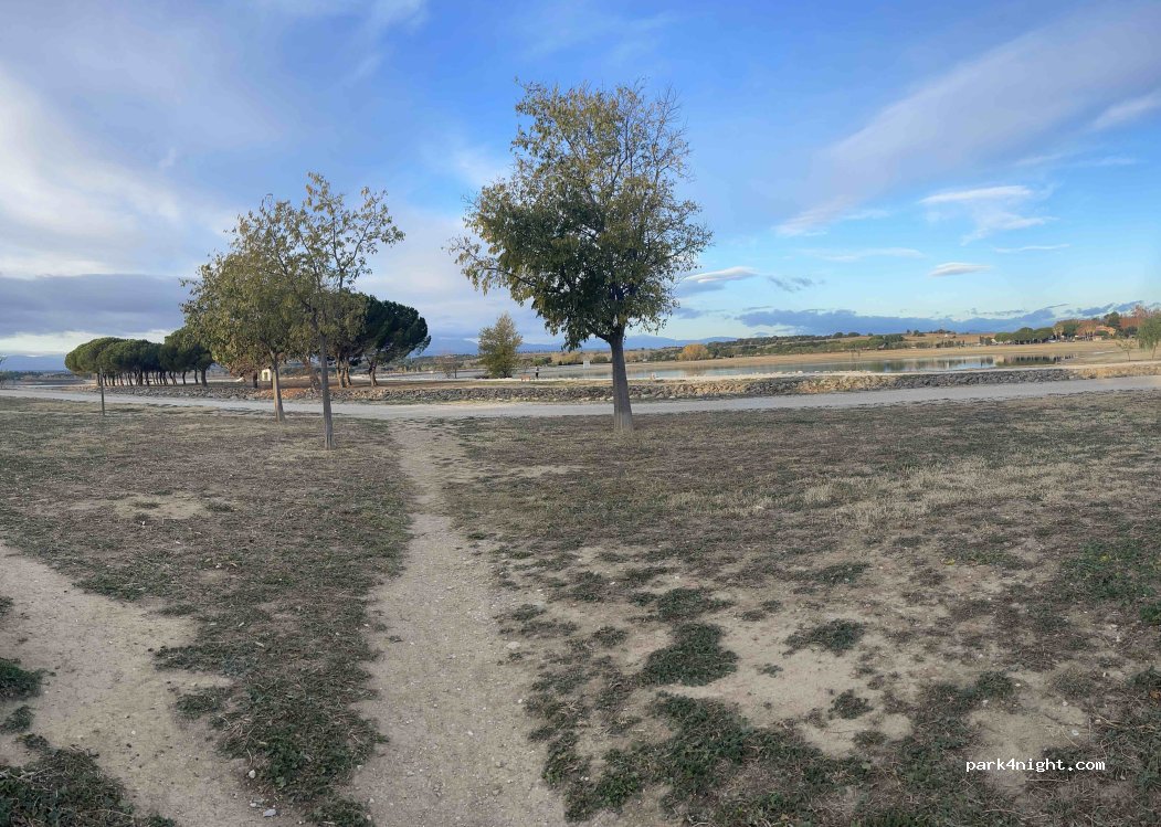 Perfecto para pasar la noche, buenas vistas y acceso al lago. No hay ningún cartel que prohíba pernoctar pero no sacamos mesas ni el techo por si acaso. Única limitación 2,10 m de altura. Dormimos tranquilos, junto con otra Camper y algún coche de los vecinos de la urbanización.