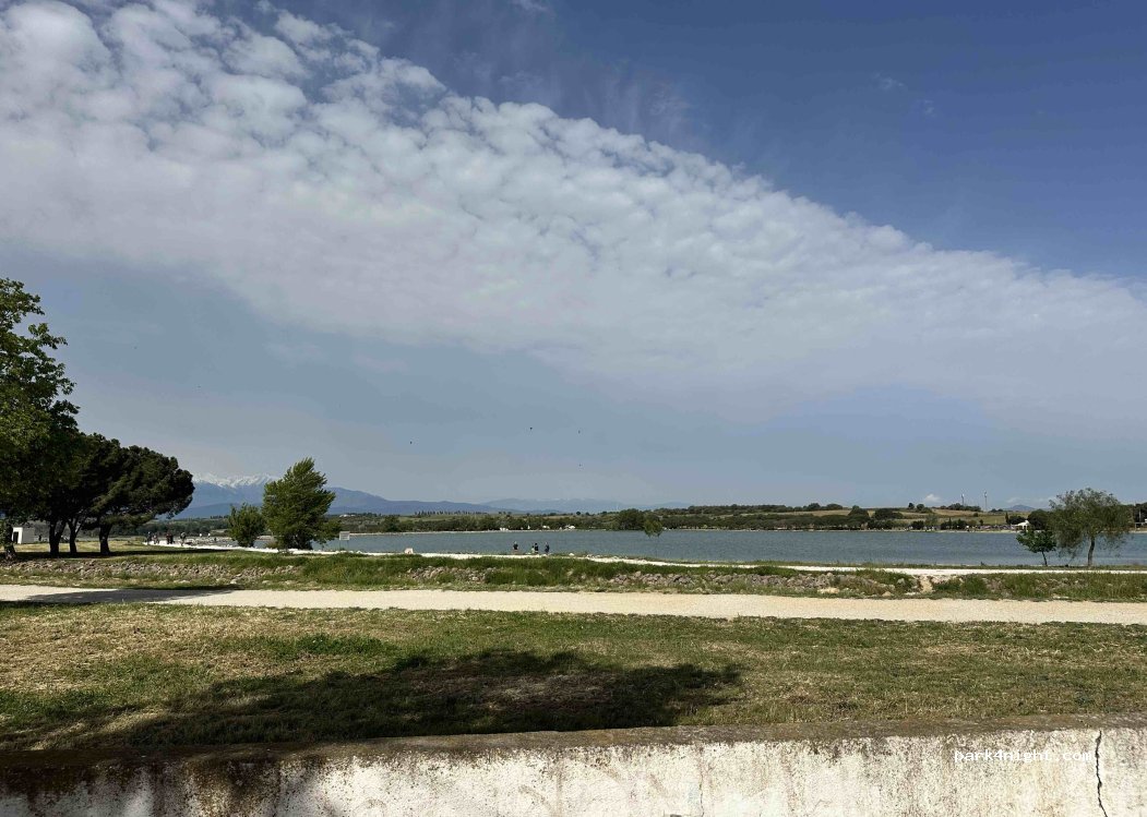 Buen sitio para para dormir y pasar el día, justo en frente el lago para poder disfrutar de un baño y zonas recreativas; posibilidad de dar la vuelta al lago corriendo o en bici. Sitio de parquímetros un poco justo para autocaravana largas ya que son aparcamientos para coches en batería. Un poco de ruido de fondo de los bares que están en frente del lago.