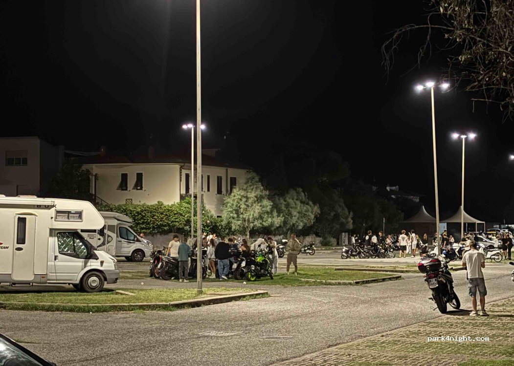 Parcheggio gratuito molto grande, senza servizi. Nessuna barriera altezza il 25 Aprile. Ragazzi con i motorini hanno girato fino a mezzanotte, ma senza fare troppo rumore. Fast-food nel parcheggio aperto fino a tardi.