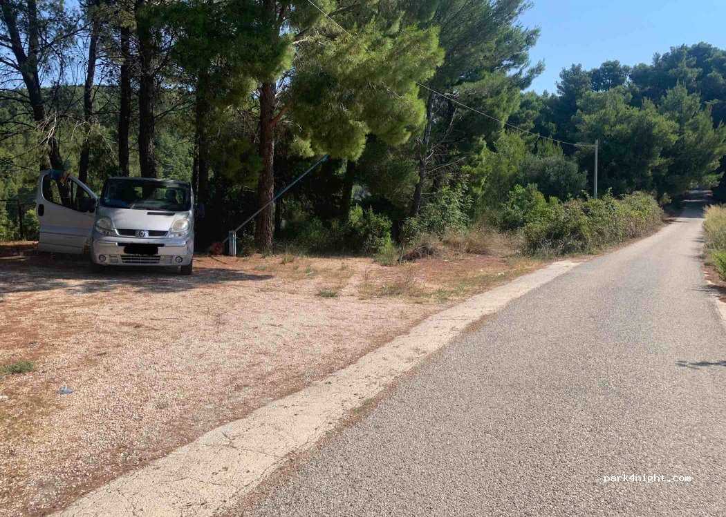Small car park at the edge of a road completely fenced on both sides (except here). Flat and little passage so really calm. We settled down for one night if nothing else. No water, sea view in the distance. This is a site that helps out. However, a lot of waste. Like everywhere… Be careful, the access road is not suitable for motorhomes (we are in a mini van)