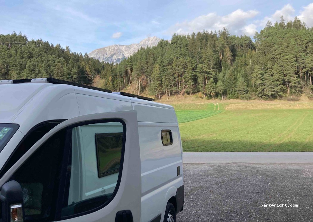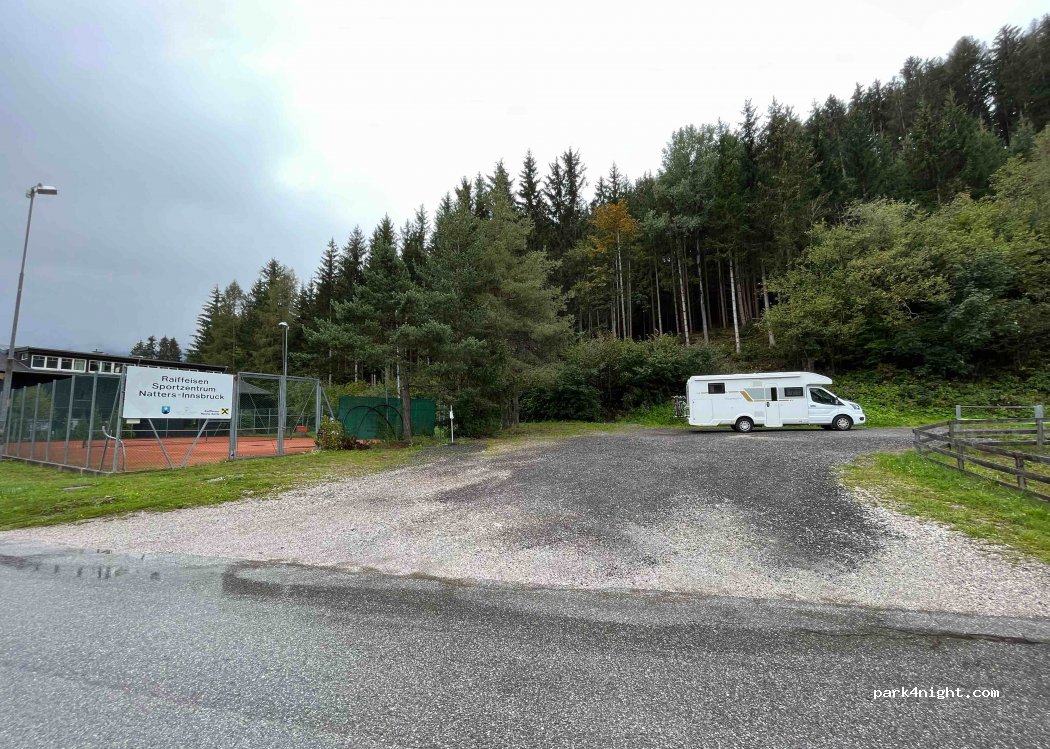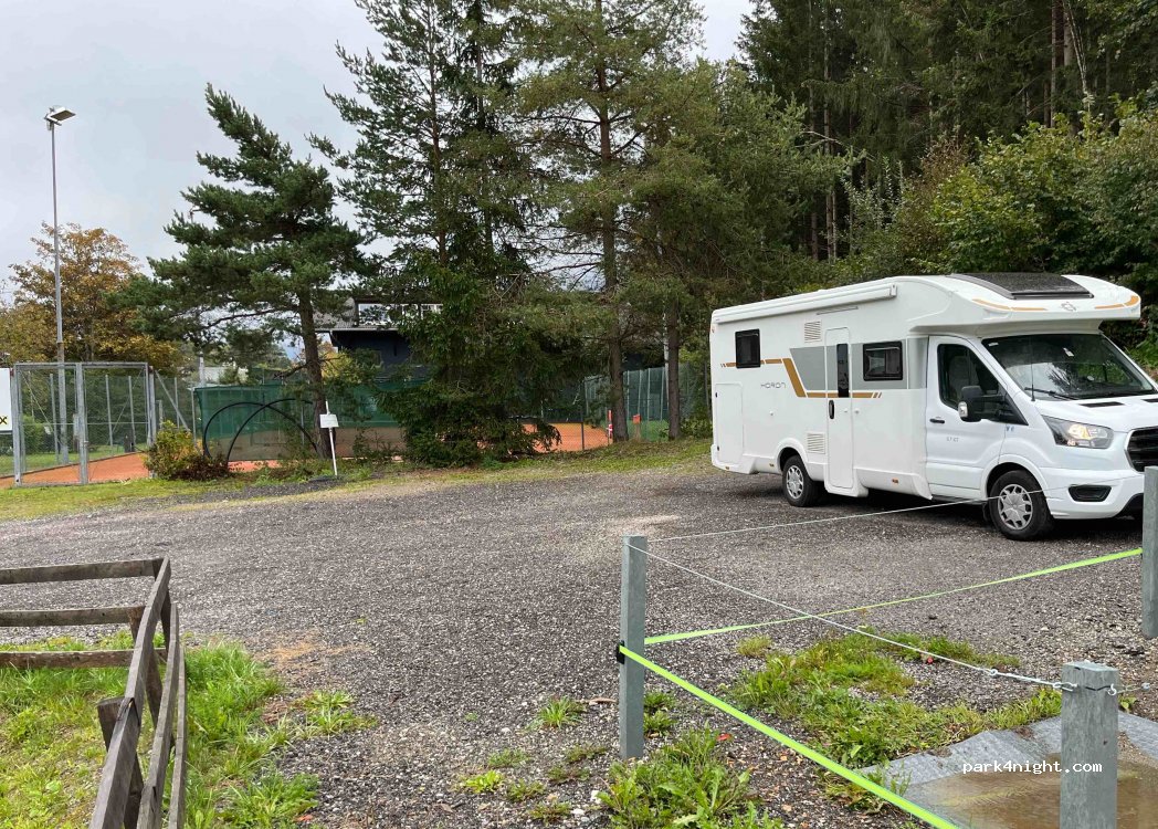 Ruhiger Stellplatz direkt am Tennisplatz, es steht dort nur ein Verbotsschild für Müllentsorgung. der Platz ist leicht schräg bietet Platz für 3-4 grosse Camper 2-3 kleinere.