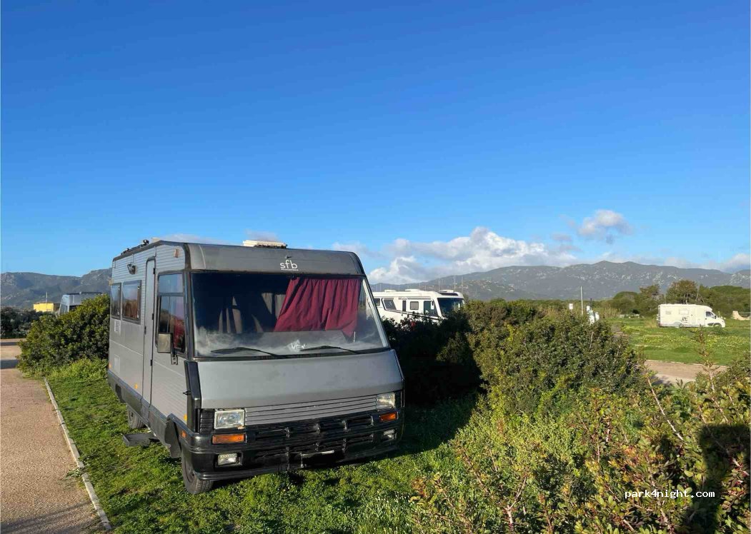Bel espace facile d'accès de parking, tranquille près du site archéologique de Nora. 4 € pour la journée de 8h à 20h. Pas de problème pour passer la nuit. Belle plage tout à côté. Je recommande vivement.