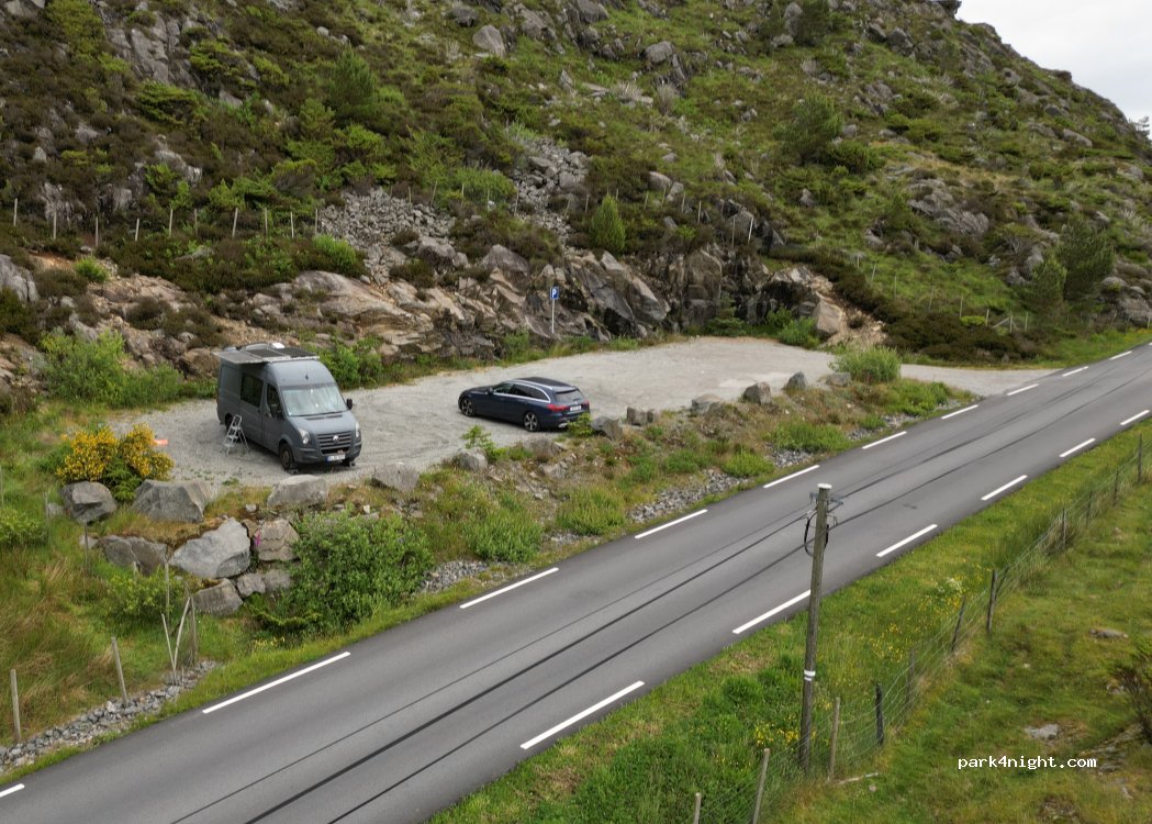 Landschaftlich schön gelegener Parkplatz für die 1,5km Wanderung hoch auf den Boknafjellet (alles breite Schotterstraße). Die Aussicht von dort ist, bei gutem Wetter, wunderschön! Wir haben eine ruhige Nacht dort verbracht.