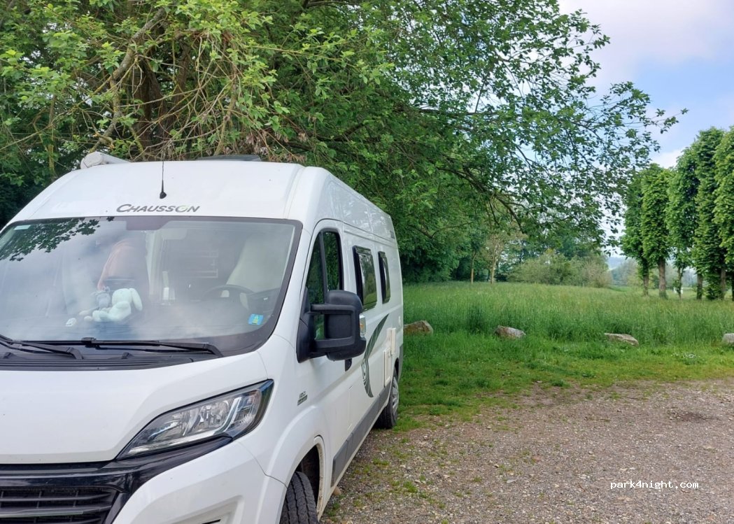 Un parking semi herbeux au bout d'une petite route habitée. Proche d'un lac artificiel et de promenades. Très calme, c'est un spot parfait, merci à la commune !