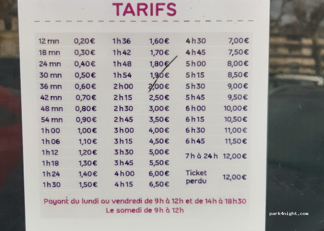 Parking en pleine ville 24/24, gratuit le dimanche ( du coup je n’ai pas regardé les tarifs en semaine désolée). J’imagine qu’il est possible de se garer pour la nuit mais pas testé. Juste en face de l’entrée du Musée d’art et de préhistoire.
