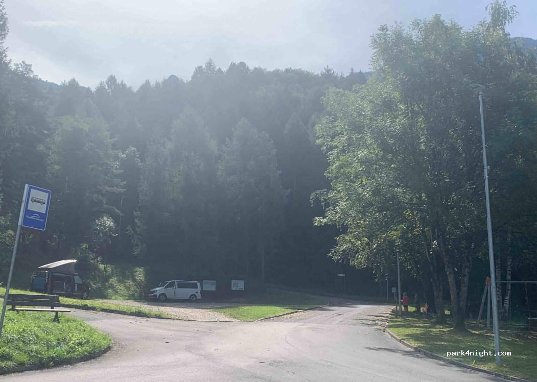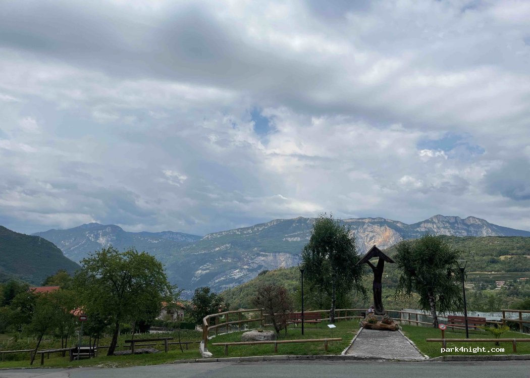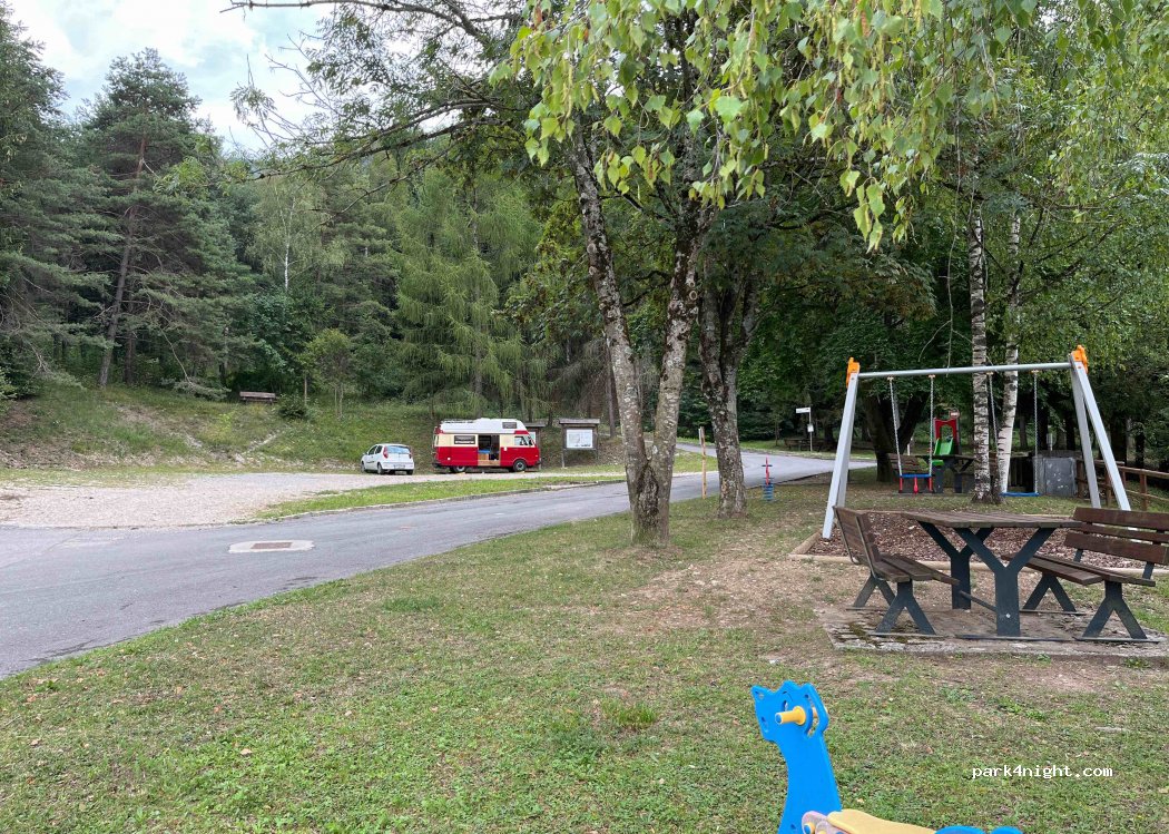 Car park in Masi di Vigo, a few steps from the pizzeria and restaurant La Genzianella. Most of the parking is slightly sloping, a couple of places are level, drinking water fountain also for water loading, games for children, 4 tables with benches, 4 more benches with a view in small well-kept corners of the park. Here the departure for short excursions towards Malga Plan and in the woods of Vigo Cavedine following the “Masetti, chestnuts and legends” route that starts from here. We are at the edge of the forest, beautiful view, partly shade. There is only one parking sign, no other signs. Quiet for eating, great place!