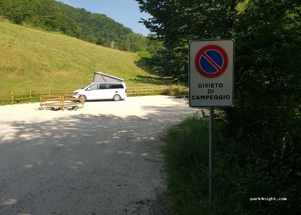 Bel endroit pour le pic-nic, malheureusement il est désormais interdit de camper, et un panneau porte l'inscription: "Divieto di accesso camper roulotte..." Pente de 10% à la descente pour accéder. Dommage.