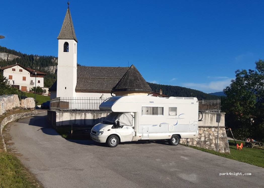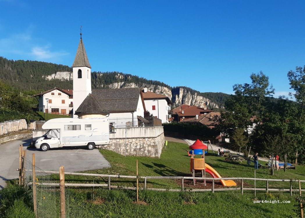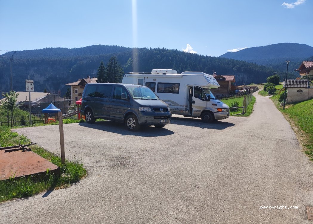 Parking on the side of the municipal playground adjacent to Campo Santo. Free parking without tolls. practically level ground in asphalt. 5 car parking spaces. For campers over 6m, I recommend parking in the back with a cantilevered locker so as to allow the circulation of cars to private homes. From here an easy walk to visit the Tret waterfall. Hotel with restaurant in the street below.