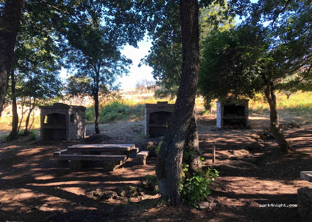 A la salida del aparcamiento hay a su izquierda una puerta (que estaba abierta). Detrás de ella una pista transitable lleva a un amplio merendero con mesa y barbacoa de piedra. Continuamos por la pista para acceder al aire de abajo, sombreado y con una fuente. Cuidado en la bajada el camino tiene algunos baches, accesibles en 4x4 pero valiente furgoneta.