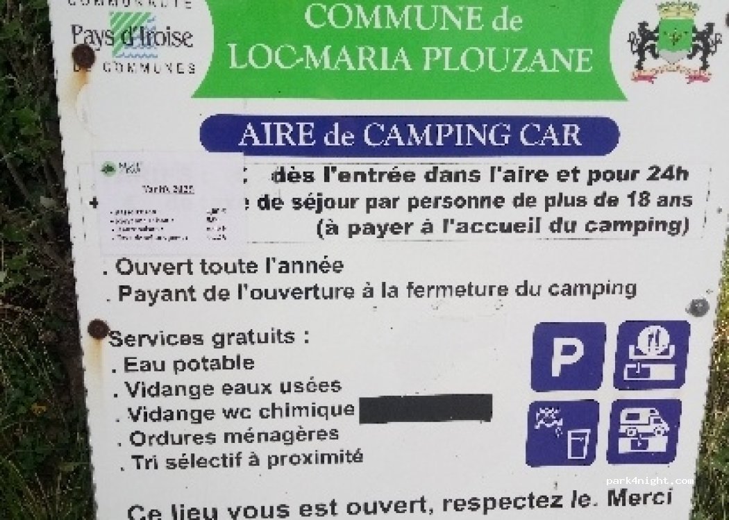 Payment success at the reception of the campsite. View of the bay of Brest. Toilets, showers, laundry dryer at the adjacent campsite, possible but not guaranteed ... Only on the opening dates of the campsite ... Otherwise no services are available, only the "waterless" cassette emptying flap is accessible at the entrance of the pitch.