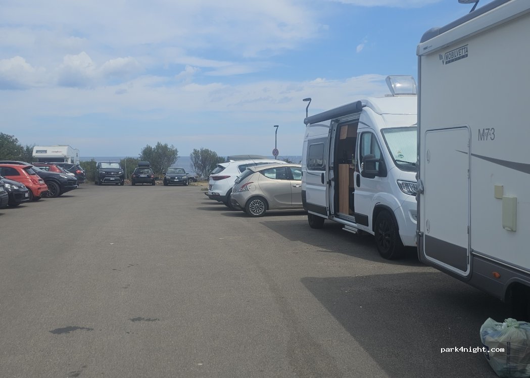 Confermo che questo e' un ottimo parcheggio per qualche notte, a fine giugno 23 c'era solo il nostro camper, zona tranquillissima, polizia locale molto cordiale e spesso in visita, conferma nessun divieto di sosta, e' richiesta solo la chiusura delle finestre laterali (parzialmente tollerata). Spiagge bellissime a pochi minuti a piedi. Nessun servizio.