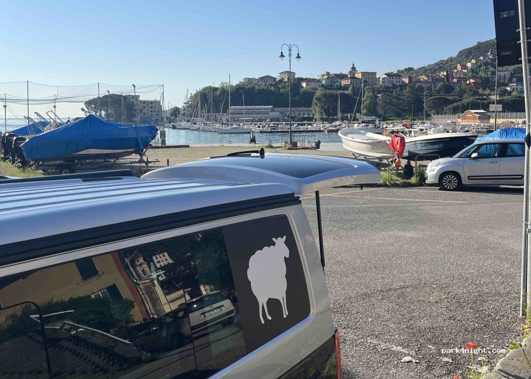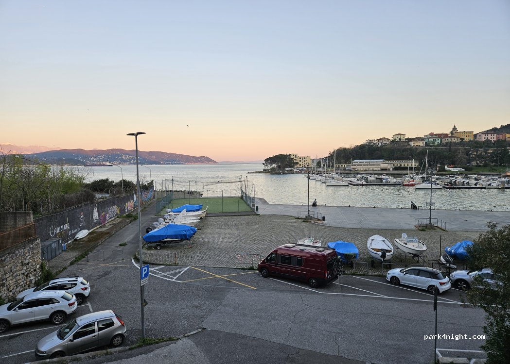 Vue mer, lumière réverbère côté bien pratique assez calme, interdit au camping car, 2m max de large. Moi je suis en kangoo pas de pb. Du coup, Restaurant a côté, a 6km de la gare pour les 5 terres