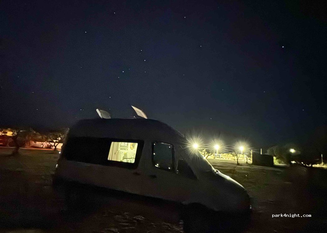 Very spacious parking lot close to a road not so busy. Other 2 vana were there so we felt safe. We could cook. Downside: the surface is made of red dirt so it is easy to get the car a bit dirty