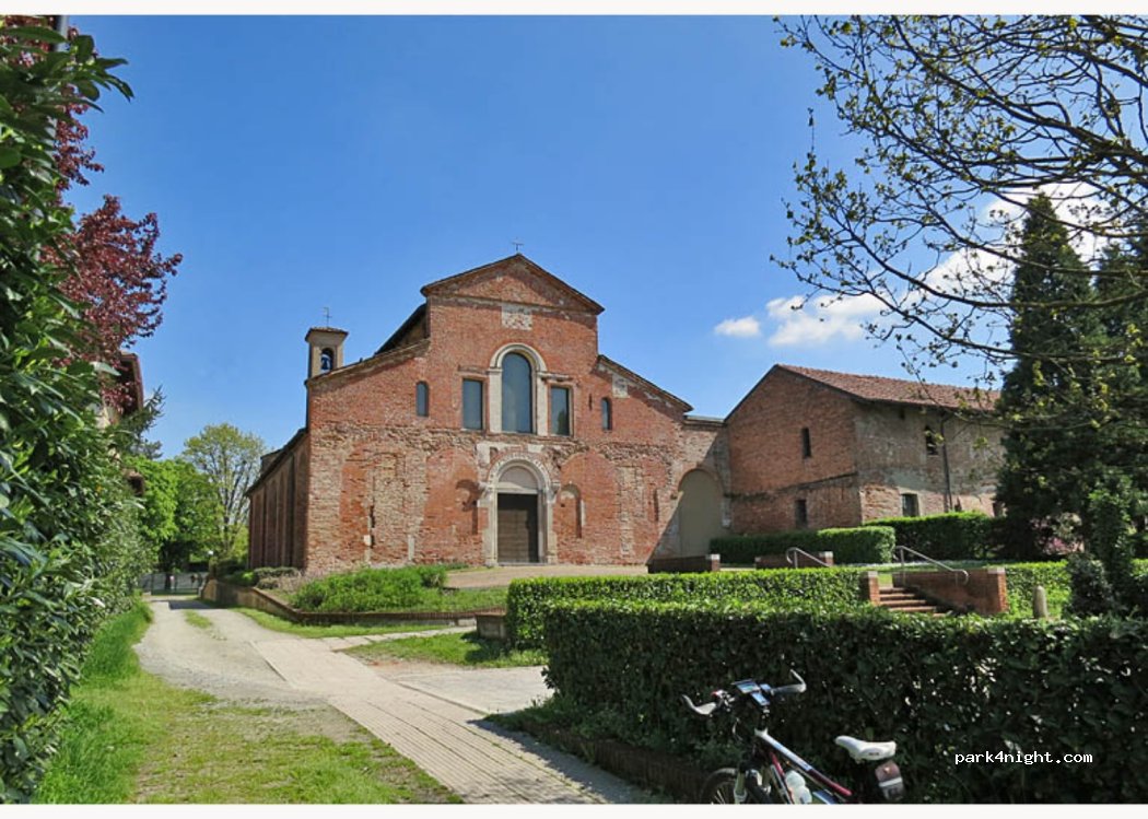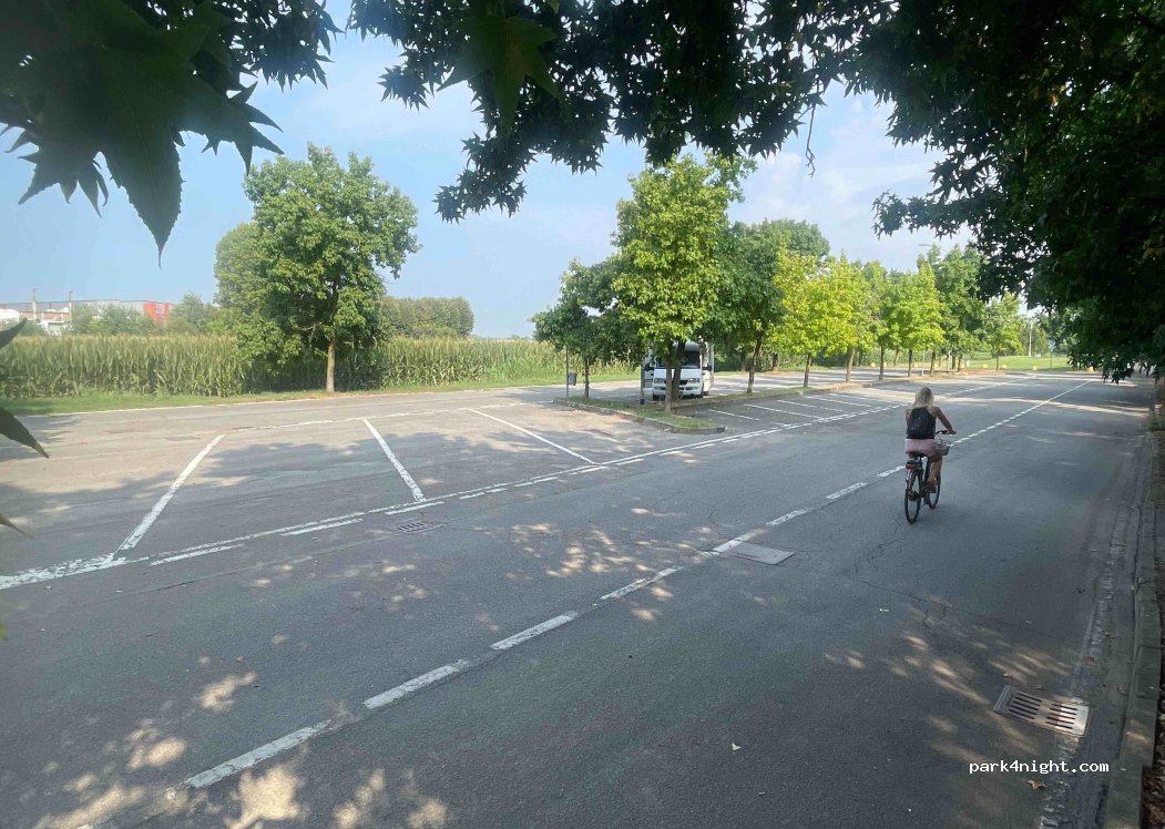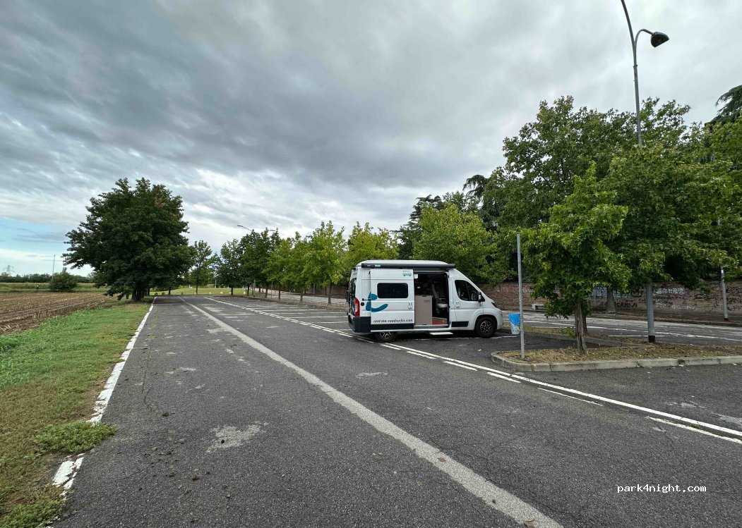 Quiet car park between the church and the hospital surrounded by some fields. Spent two nights undisturbed and felt very safe which did not seem like the case for other spots around Milan. Very well lit throughout the night and a popular path for locals to walk their dogs.