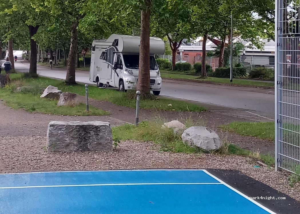 Seemingly quite area which it was at night but construction opposite started at 7am and was piercingly loud. Park nearby. Lots of bins. Don’t make it into Freiburg due to a flat tyre and 7 hours waiting for recovery!