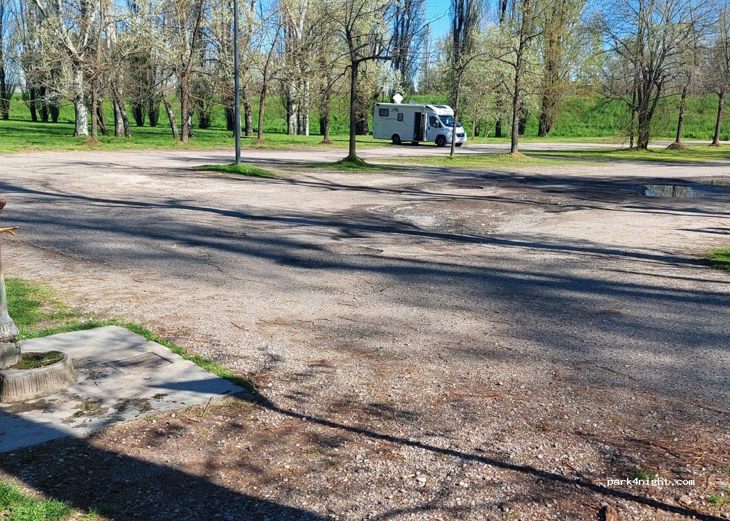 Nice place. Close enough to walk to Cremona centre. It was quiet, nice park to walk around, a drinking water tap, rubbish bins and two other campervans which made us feel safe.