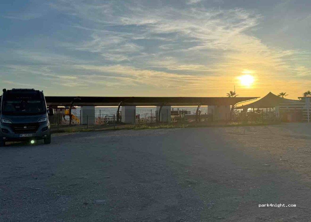 Prima Platz zum Übernachten direkt am Strand. Außerhalb der Saison kostenlos. Liegt viel Müll rum, aber stört nicht. Polizeistreife kam vorbei, aber gleich weitergefahren. Toller Sonnenuntergang und nachts sehr ruhig.