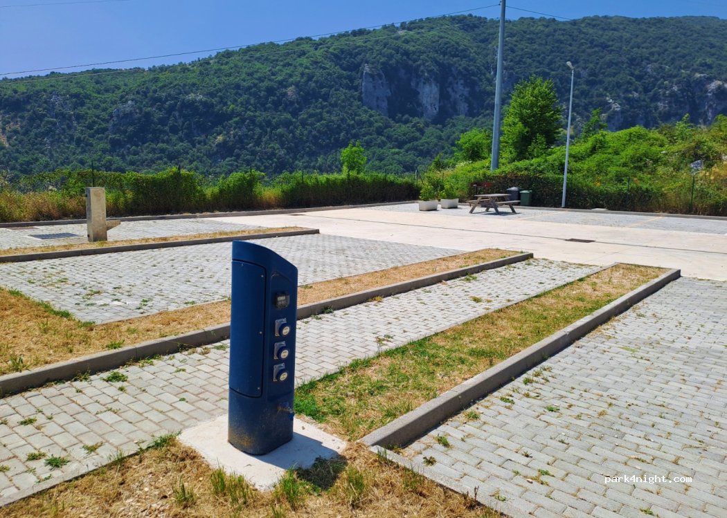 Una bella area sosta! Tutto funziona, ben tenuto e con anche BBQ. Accoglienza fantastica, i locali vogliono farti scoprire i segreti del paese. Ho conosciuto il sindaco che ha intenzione di mettere una piscina e parcogiochi per i bambini. Ristorante a pochi passi, negozio alimentari in centro, possibilità di noleggio bici elettriche a 20 metri dalla sosta. Falesia per l'arrampicata