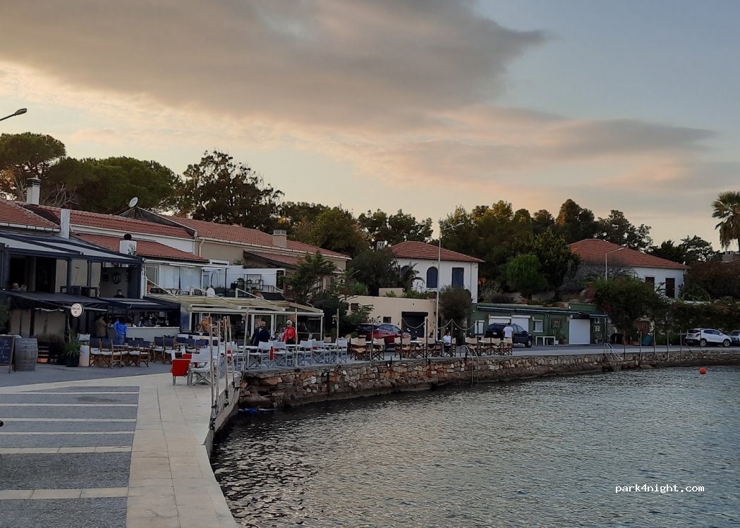 Great place to park in off season. Plenty of room. Can watch fishing boats come and go. Very expensive cafes and bars not far - 450tl for a cocktail but they have a lovely setting and would be good for a special dinner or occasion. Cheaper places to eat in village. Close to supermarket, bins and toilets in the area. Way in is a bit tight.