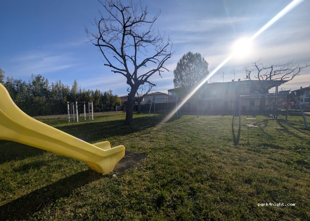 Parcheggio gratuito in zona residenziale affiancato a bel parco giochi con fontanella acqua e area cani.