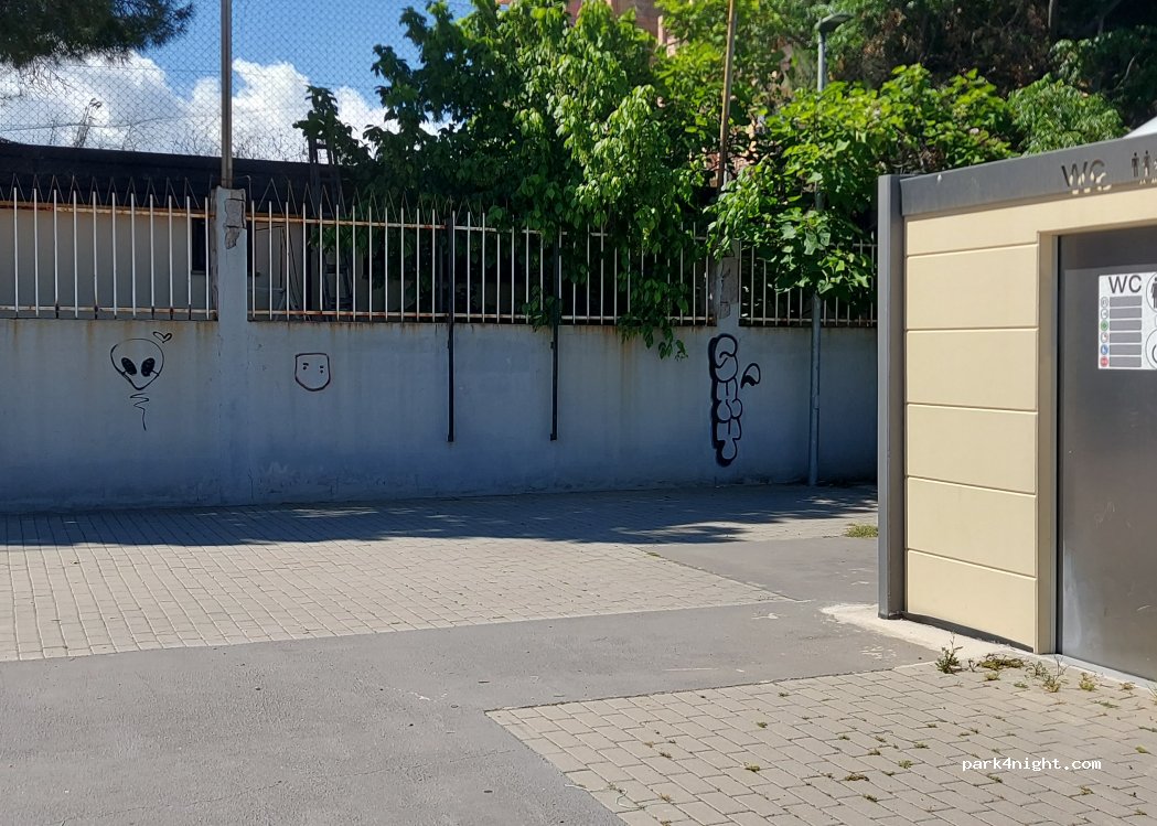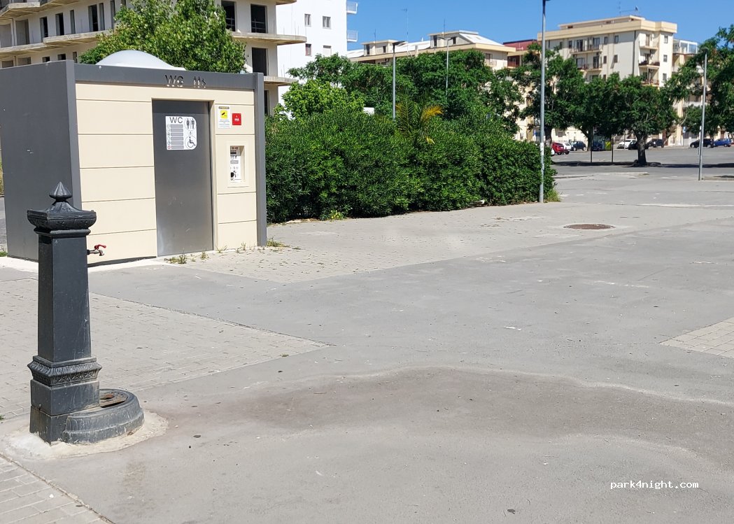 Place du marché avec robinets d'eau et eau douce. juste à côté se trouve un supermarché avec des produits de boulangerie. Vendredi jour de marché puis stationnement interdit. nous ne sommes pas restés la nuit mais avons fait le plein d'eau. la plage a fait une impression propre et bien entretenue, il y avait d'excellents dolci sur le corso dans le café soverato dolci