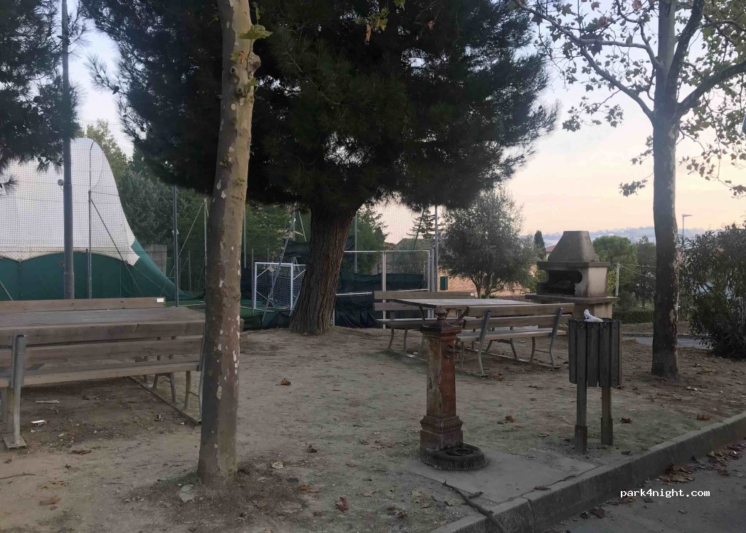 Area camper con c/s e corrente gratuita adiacente a un campo di calcio ci sono delle panche e tavoli sotto una pineta. Paesino a circa 5 minuti a piedi.