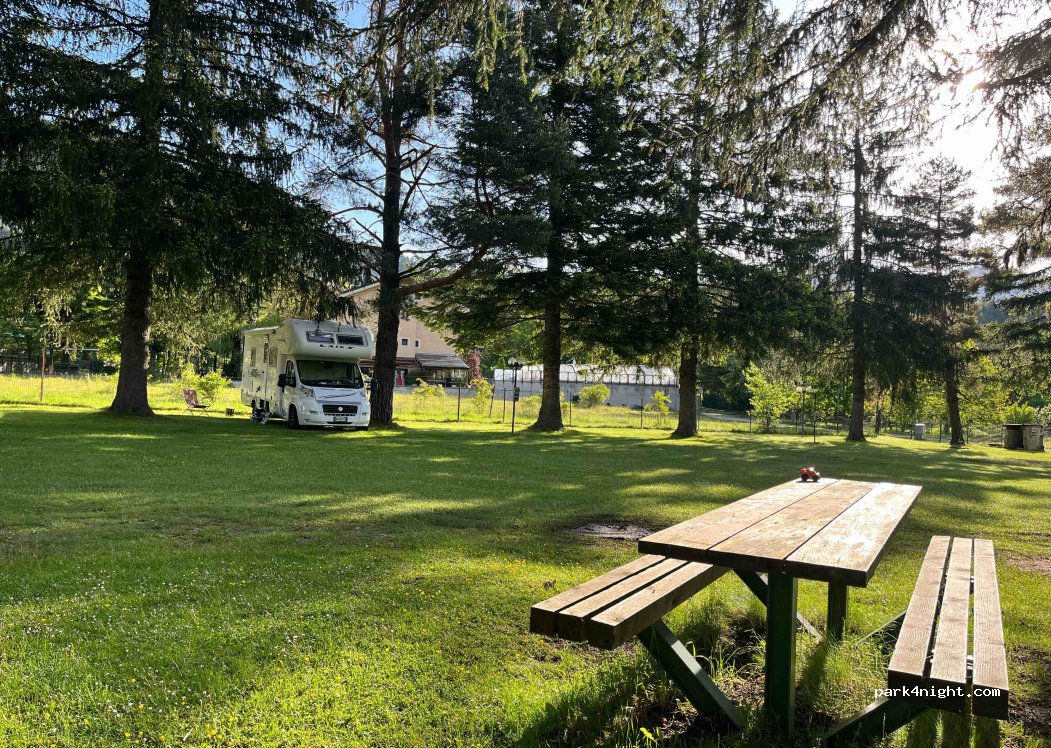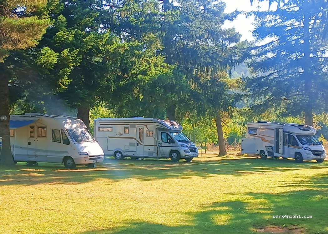 Bellissima area camper (non campeggio), posti camper in mezzo ai pini con splendida ombra, 10 min a piedi al paese molto carino. Gerando un personaggio. I servizi sono minimi ma gratuiti e puliti, docce calde (1 uomini e 1 donne) 1 bagno, se si vuole di + (forse) si va in campeggio. Se saremo di nuovo in questa zona, questo sarà il ns. punto di sosta.