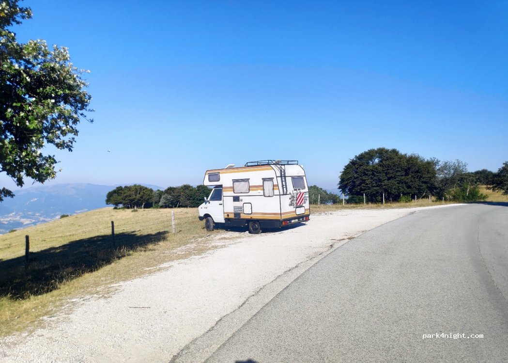 Entlang der Straße, aber sehr ruhig, passieren nur sehr wenige Autos. tolles Panorama. ausgezeichneter Ausgangspunkt für Ausflüge nach Monte San Vicino, Confaito, Elcito. direkt über einigen schönen Picknickwiesen mit dem Schatten einiger Bäume