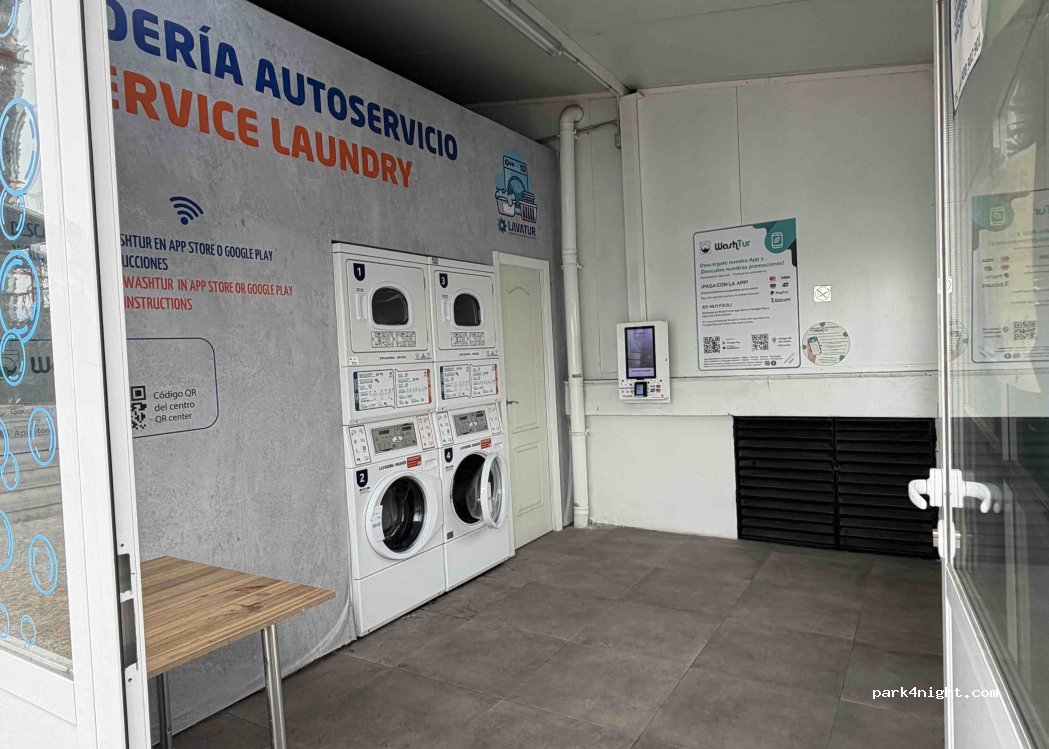 Perfecto para tomar café. Tiene autolavado para autocaravana y furgos con escalera para limpiar las placas del techo. duchas disponibles por 3,5€