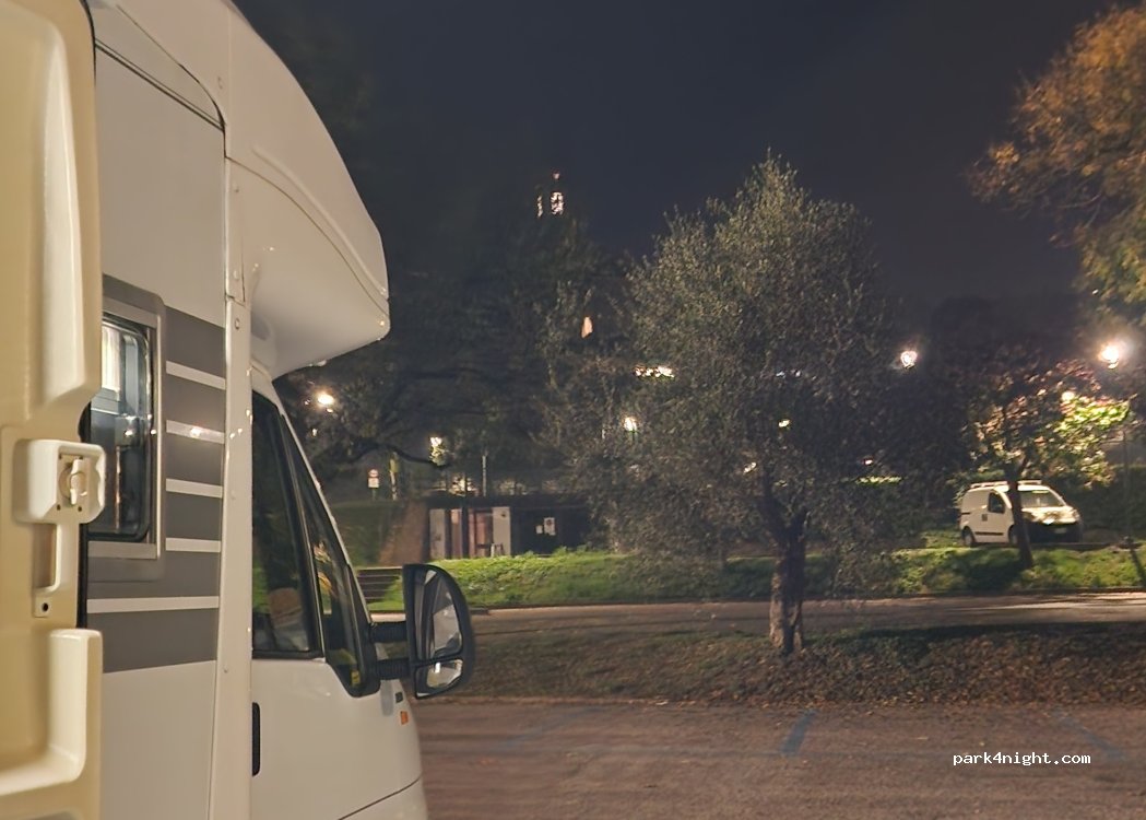 Parcheggio a pagamento dalle 8 alle 24. Ci sono i bagni gratuiti ma nessun altro servizio. Stalli dimensionati per le auto (ci si sta con il retro nelle aiuole), a 5 minuti dal centro del bel borgo. Nel parcheggio superiore, vicino la fermata dei pullman turistici, c'è qualche spazio per camper più grandi. All’inizio del parcheggio disponibili strisce bianche (12 posti) con disco orario, max 1 ora dalle 8 alle 20.
