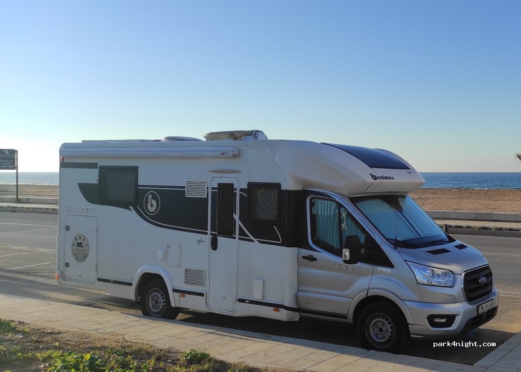 Public car park next to the beach. In December free of charge. About 3km to the city center of Trapani (10-15 min by bike). Near to the busy road and to the beach club. We spent 2 nights there. First one was ok, but the second was noisy because of the party in the beach club.