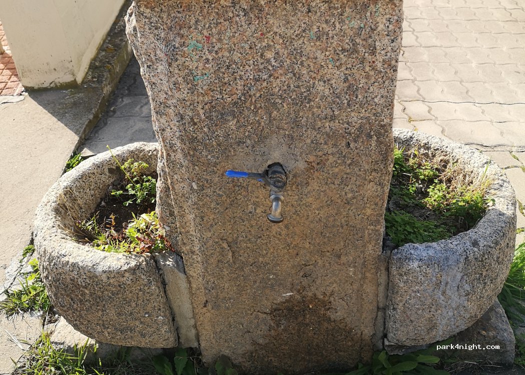 Fountain with good flow. Screw connection. I don't know if drinking water. Possibility of convenient parking for loading.