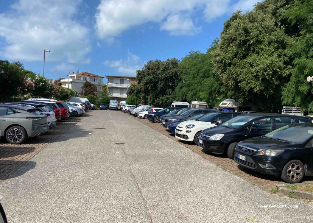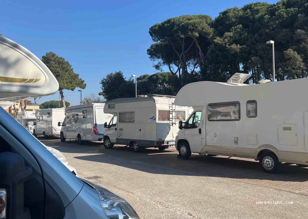 We spent the weekend here for free, it's been quite alright. Other motorhomes were coming and going, and the parking is spacious, it's been busier on Sunday afternoon, otherwise many spots were free. There are some shady slots from late morning on. There are no trashbins nearby. Beaches are at walking distance, and a huge nice park extends from the parking to the centre of Viareggio.