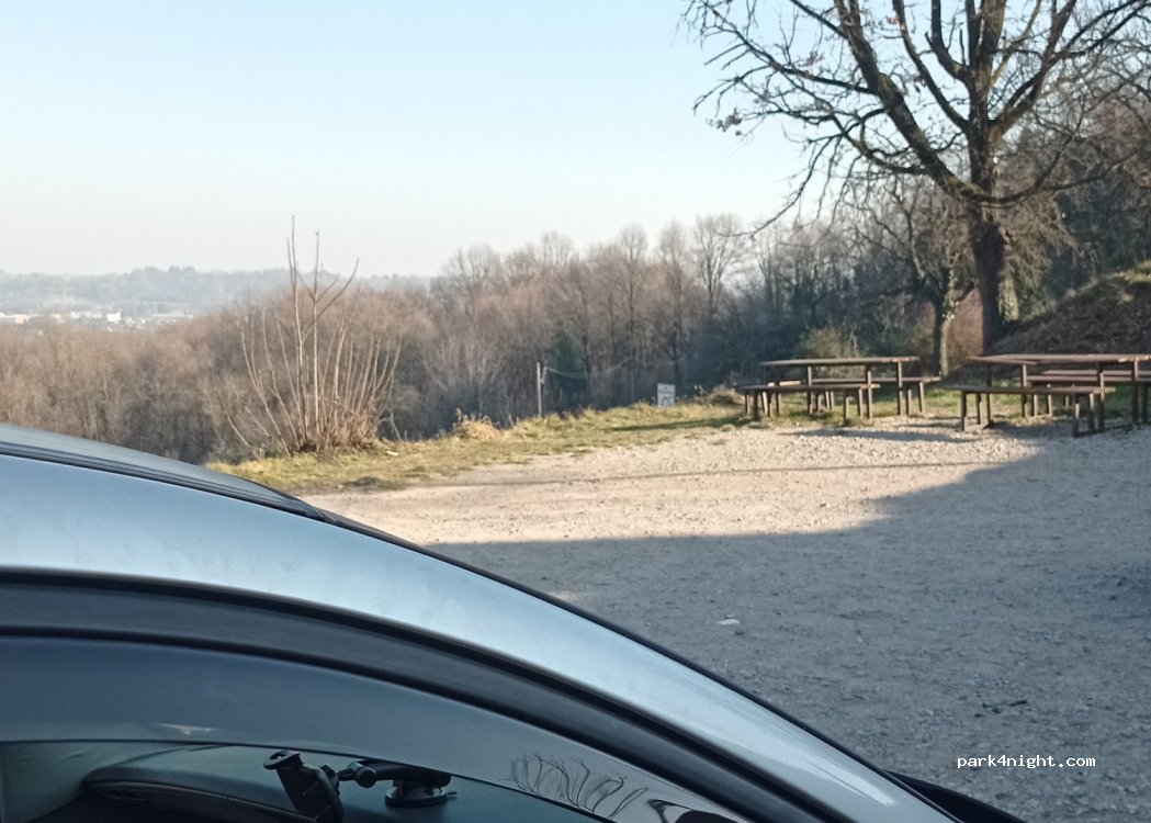 Onverharde parkeerplaats bereikbaar vanaf de weg met een klein, vrij steil klimmetje, er staan twee picknicktafels. Gehecht aan de paden en de cipressenheuvel. Geen straat, alleen trappen. Meer parkeerplaatsen