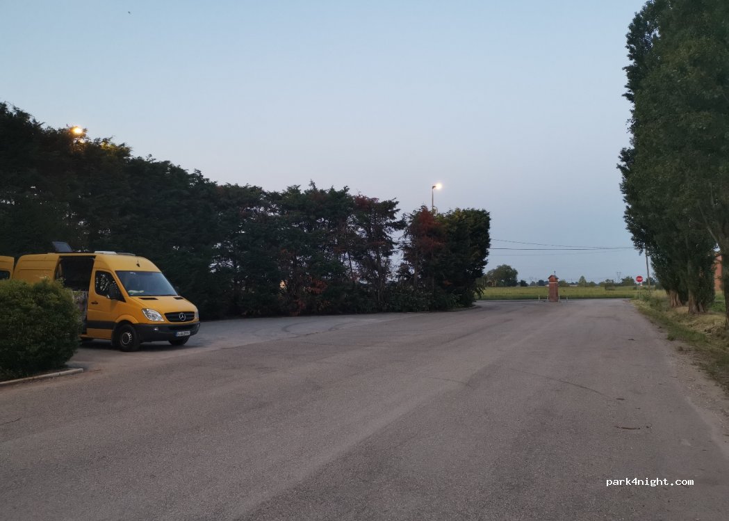 Posto tranquillo dove passare la notte. Nessun servizio. Parcheggio su cemento leggermente in pendenza. Di fianco a strada statale trafficata ma la notte poco traffico. Sul sentiero di decollo dell’aeroporto di bologna quindi puó essere un po’ rumoroso di giorno ma la notte molto tranquillo. Ottimo per spezzare il viaggio e stare tranquilli.