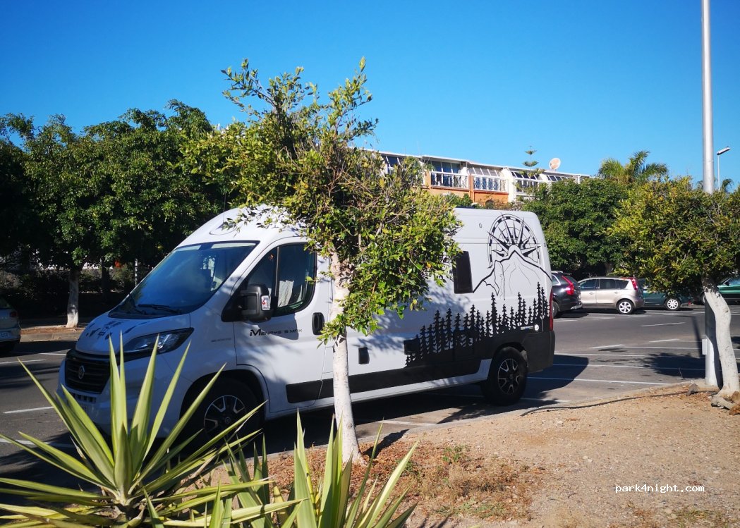 On the edge of the Los Cristianos promenade and a few minutes walk to local, mostly Brit bars and restaurants. However, the furthest car park in front of apartments is not public and police arrived at 11am to move on campervans. Not recommended unless you arrive late and leave very early.