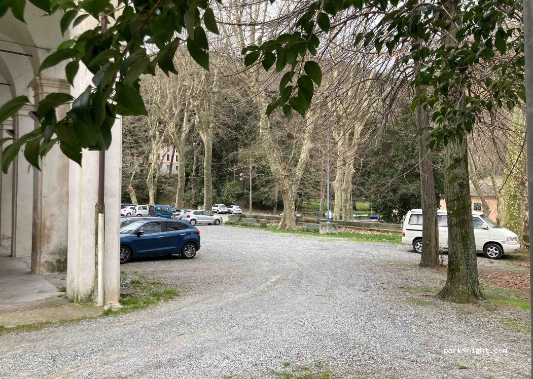 Grand stationnement devant le Sanctuaire, surface en gravier, plusieurs stationnements pour voitures ou autres. Il y a aussi des toilettes avec eau du robinet dans le sanctuaire ouvertes pendant la journée. Endroit idéal pour les thermes de Gênes Acquasanta.