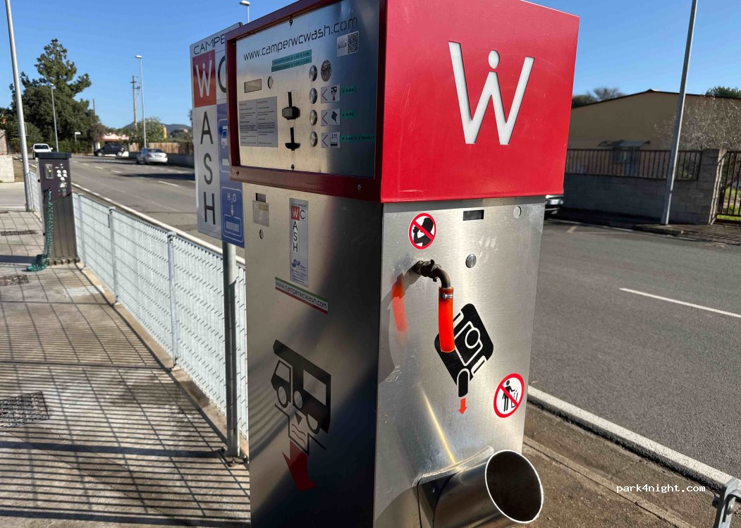 effectivement c'est tout neuf et très propre mais ne prend que les pièces d'un euro et rien pour faire la monnaie à proximité...... un peu galère de trouver 11 pièces d' un euro nous partons sans vidanger pour aller sur Gagliari , sur une aire de parking plein centre avec tous les services