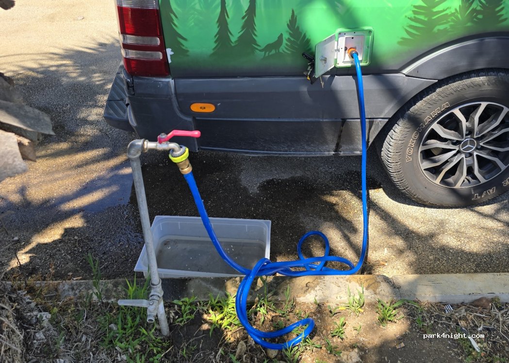 Wasserstelle etwas versteckt zwischen den Palmen. Von beiden Seiten anfahrbar. Guter Wasserdruck. Hahn hat eine Schnellkupplung.