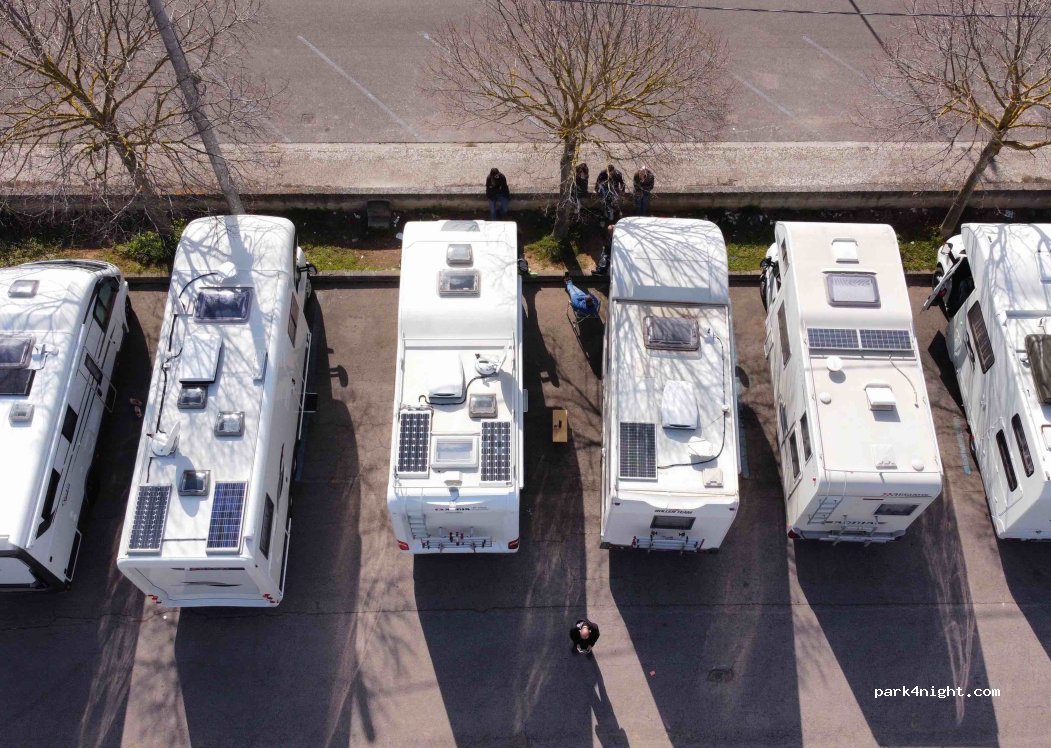sostato pomeriggio e pernottato la notte anche se soli ci siamo sentiti al sicuro! 10 minuti a piedi e sei nel centro storico. bella cittadina la basilica di santa Caterina vale da sola la sosta. non esistono più i parchimetri c'è il cartello pagamento 3 euro/gg in casi di manifestazioni.