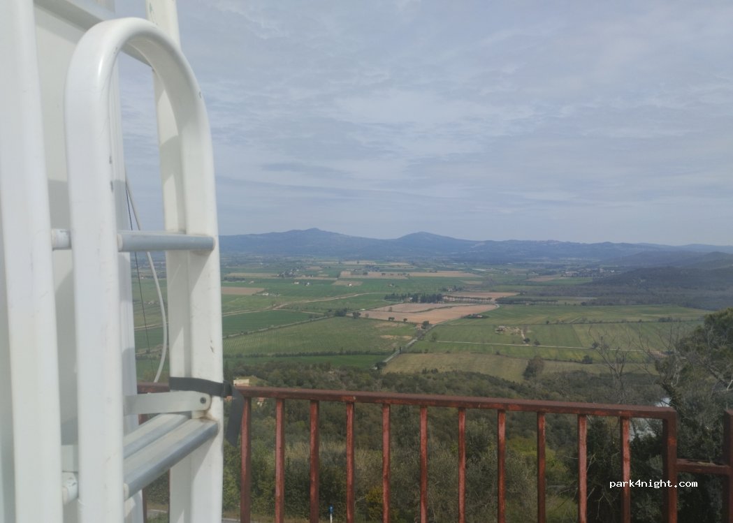 Parking in the village, indicated, wide and panoramic. don't be scared of the climb to get there, you go up easily. fairly level ground. no service. lit up at night.