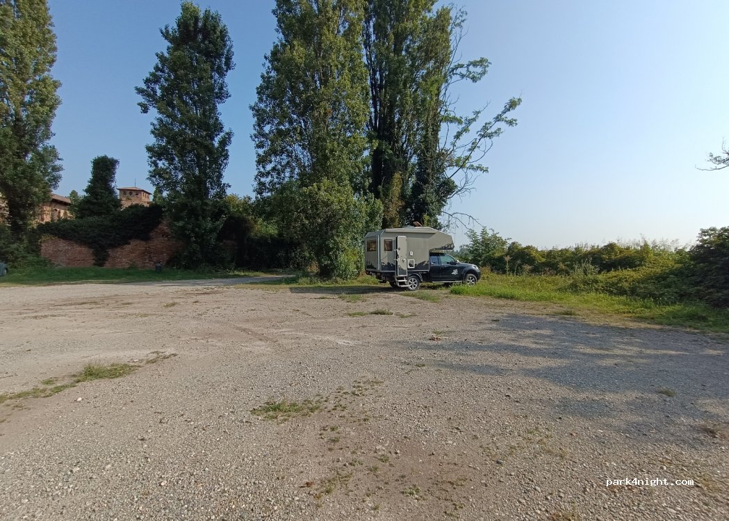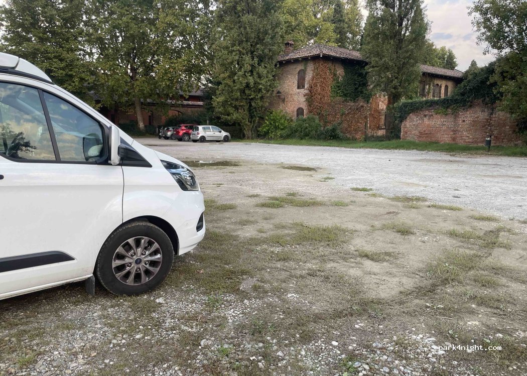 Large parking lot at the Castello di peschiera Borromeo. Slept there one night in the car but there were no signs prohibiting mobile homes or the like. Parking is free. Great way to sleep off the beaten path near Milan.