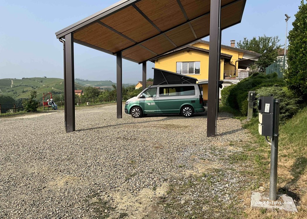 Area di sosta comoda e silenziosa con camper service e corrente a pagamento 2 attacchi . Vista mozzafiato sui vigneti. I parcheggi sono un po’ in pendenza quindi consiglio di mettere i cunei . A due passi dall’area bar è piccolo market . Unica pecca ad oggi rubinetto acqua per carico camper chiuso