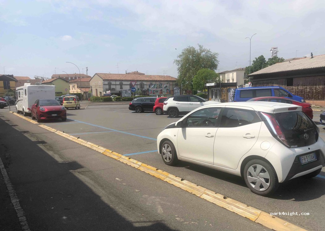 Parking along the road that runs along the walls of piacenza. Just adjacent to a military zone. Quiet: parking on blue lines with a rate from 9:00 to 19:00 on weekdays. Quiet and about 800 meters from the center, reachable on foot. Found because the camper area is full. Recommended for a quick stop or for one night at the most because without services but illuminated.