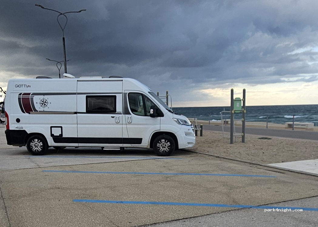 Per ser un parking està prou bé. Està just davant del mar. La nit es gratis i el dia es paga a 0,5€ hora (09.00 a 19.00). Arriben els cotxes de bon matí.