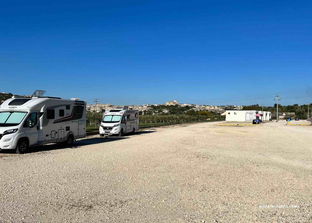 Parcheggio estremamente ampio, in debole pendenza su ghiaietto. Buio di notte e un po' isolato, ma molto silenzioso. Lontano dal centro di Modica. Noi al mattino ci siamo spostati. Consiglio di sostare vicino alle aiuole sul lato Nord, per restere lontani dalla strada di accesso e dal rumore delle auto al mattino.