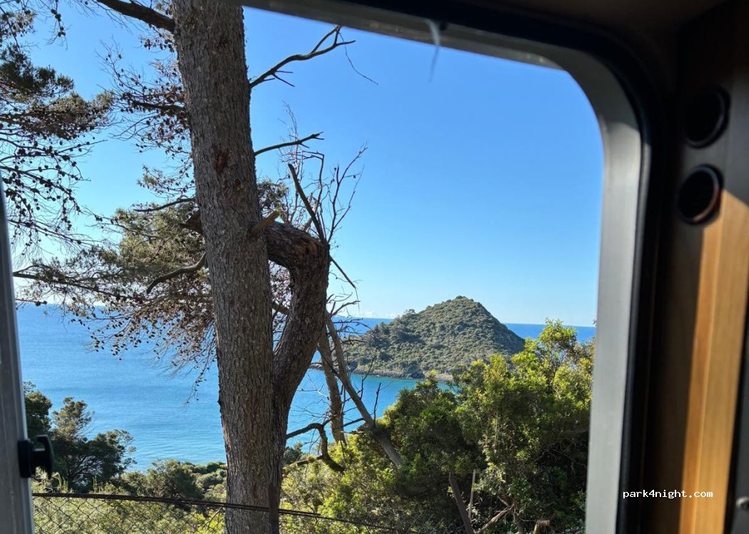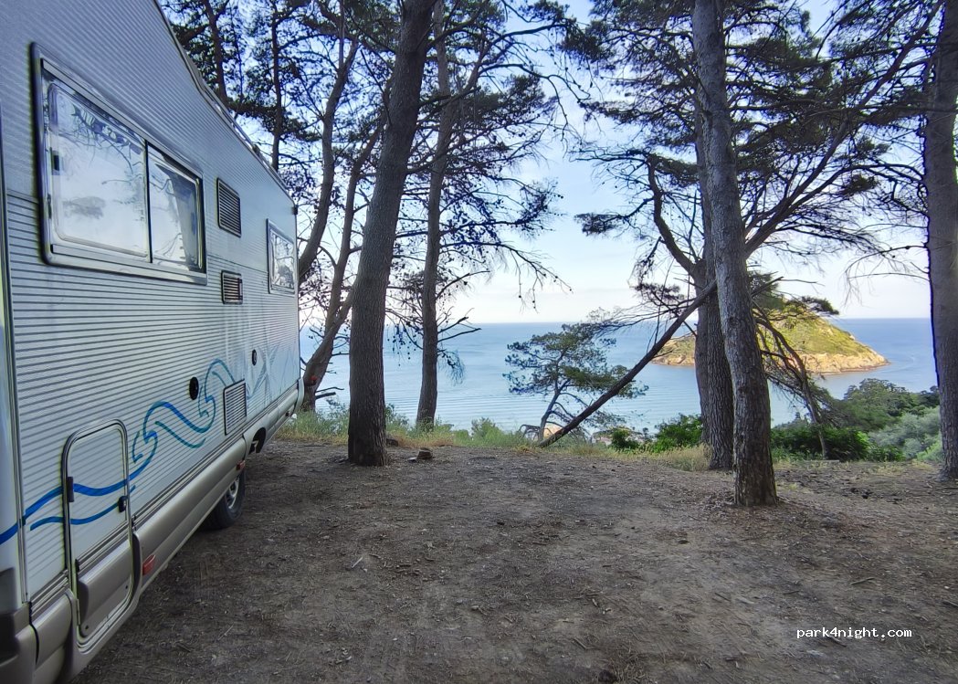 Very tricky one, but beautiful!!! Road is tight for big campers. There are signs forbidding passing campers through Porto Ercole, not sure how legal the sign is, we went through and the police did not care. The place is next to the road - 2-3 campers maximum. It is on top of a hill with an amazing view, a small restaurant next to it. The city is a 10 minute walk. Restaurants are pretty good.
